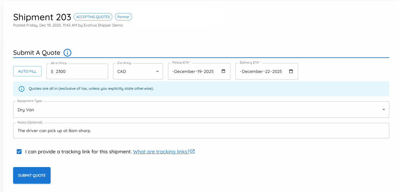 Submitting a quote on Evotrux is how carriers communicate availability, pricing, and service details to shippers. This article explains how to submit a quote, what information is required, and what happens after you submit.