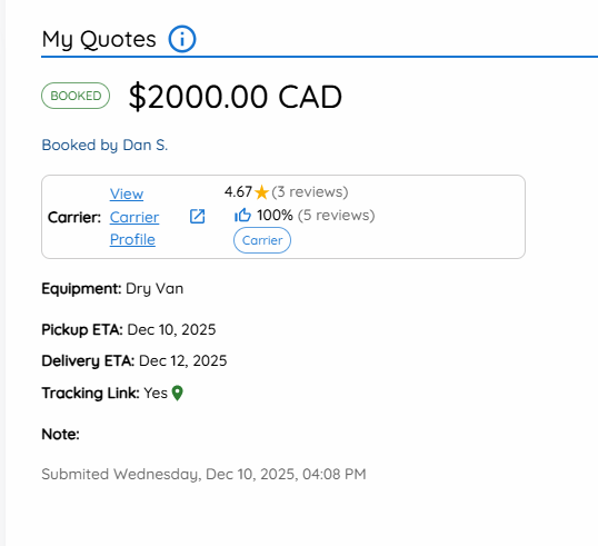 After submission, your quote becomes Active and is immediately visible to the shipper.